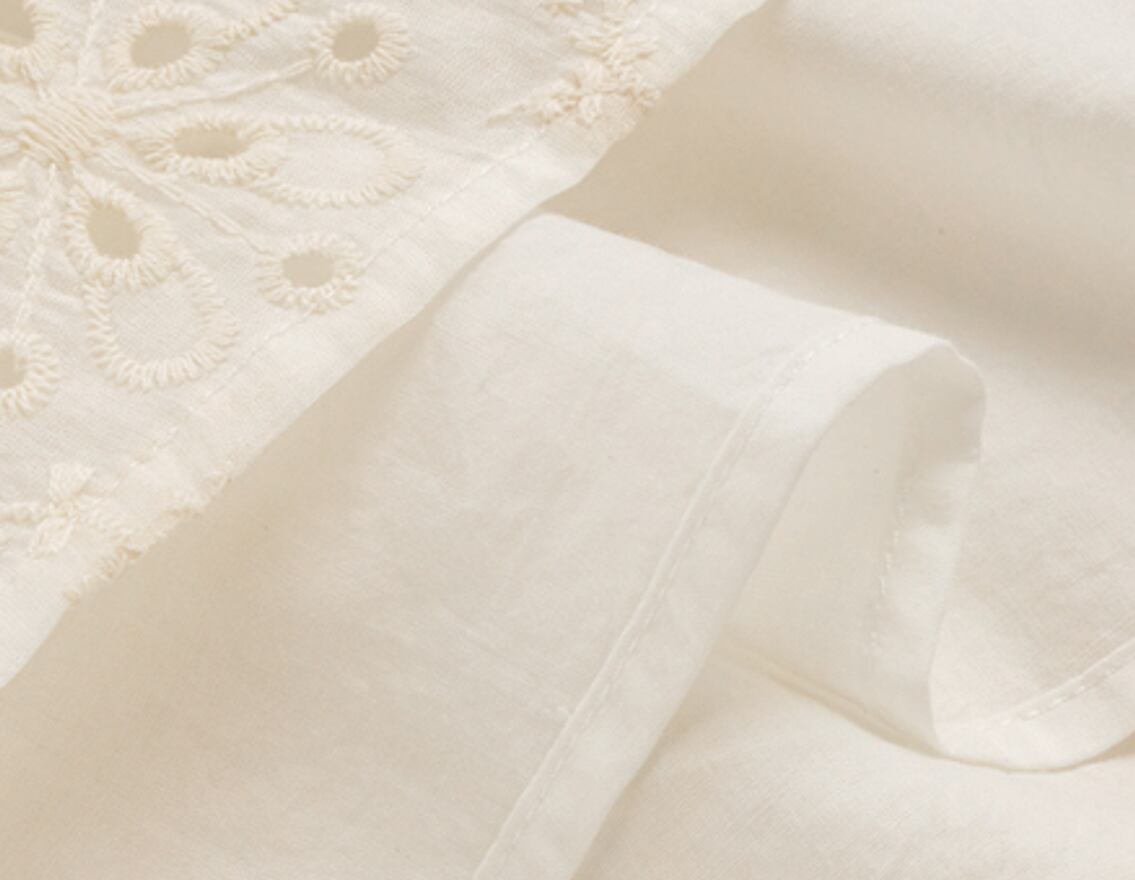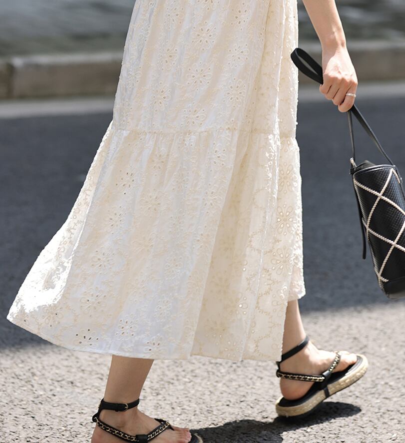 ヨーロッパ風の精巧な刺繍が施されたノースリーブロングワンピース。スカートは2つに分かれたティアードデザイン。ゆったりしたふわふわ感が体系をスリムに見せてくれます。軽くて柔らかく通気性に優れた肌に優しい素材です。夏に映えるロマンチックな雰囲気の一枚。