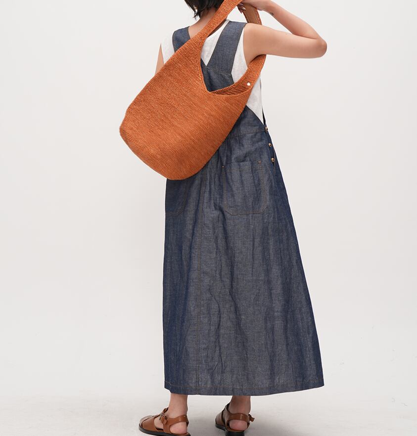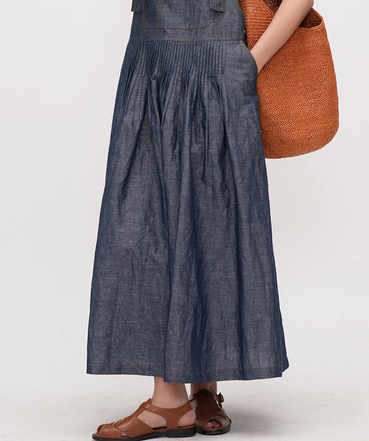ビンテージブルーデニムカラーのカジュアルサスペンダードレス。ウエストの細かいタックがアクセントの体のラインを拾わないふんわり広がるフレアスカートが魅力の一着。さらりと快適な着心地のデニム生地。
