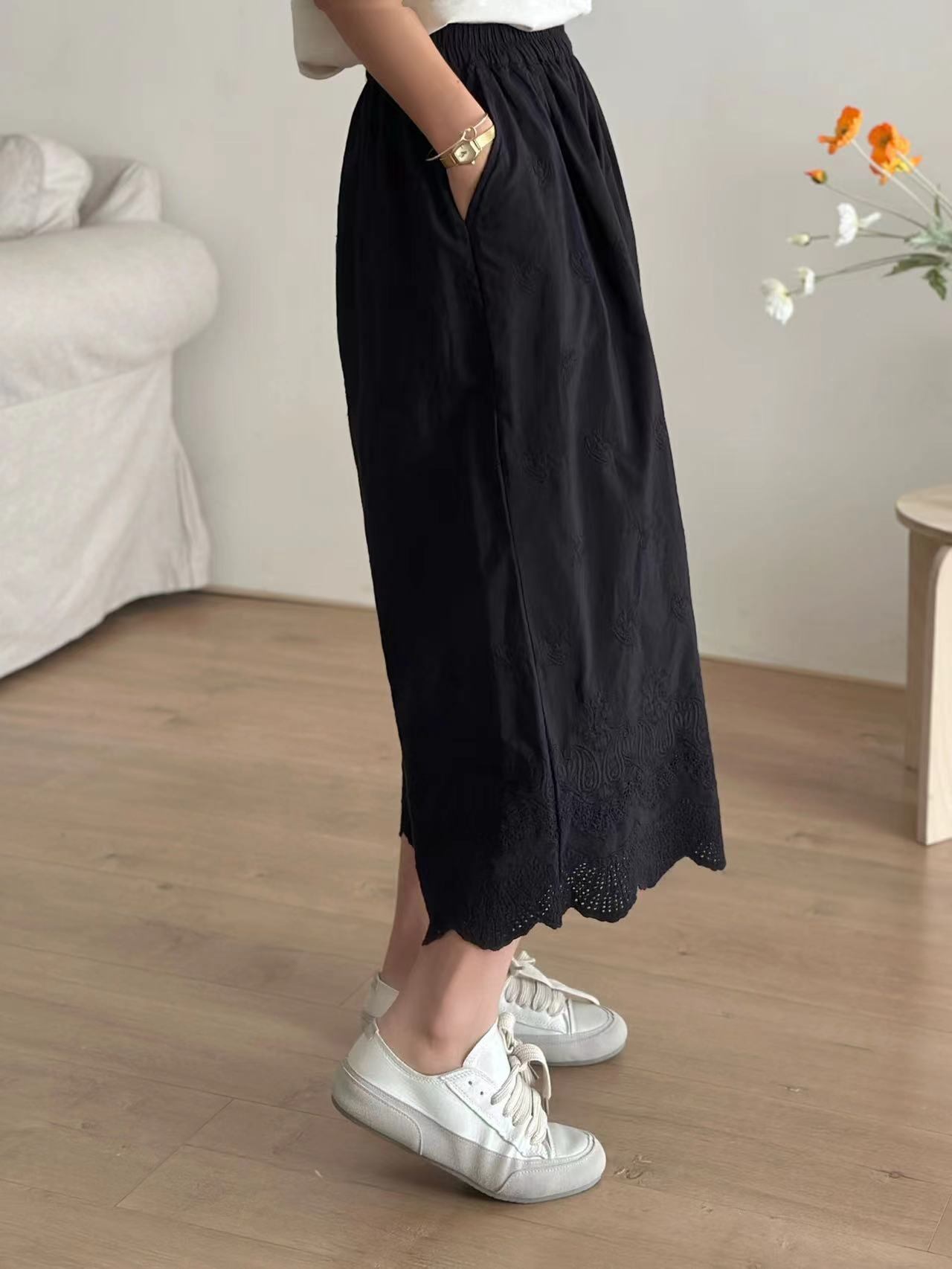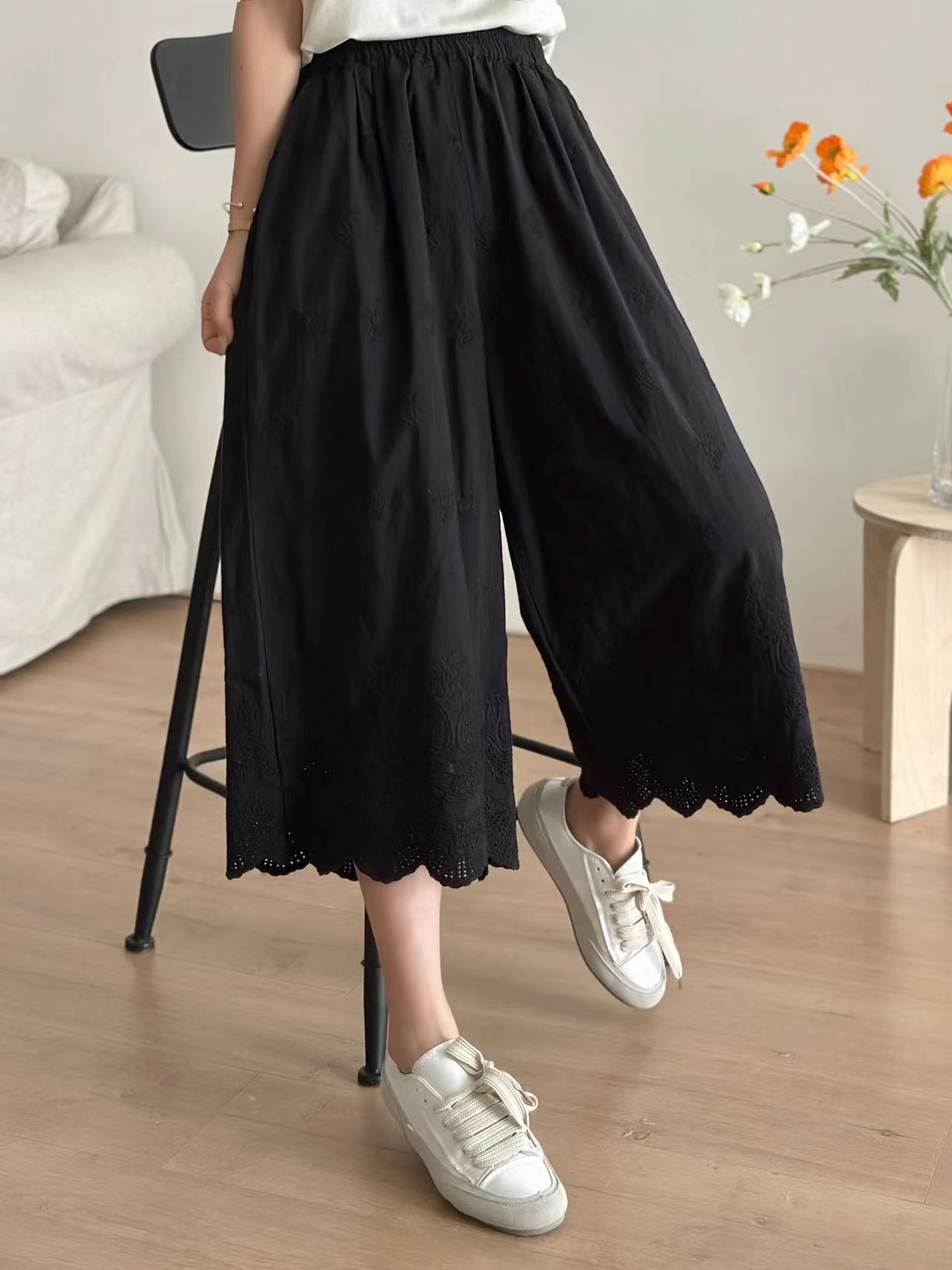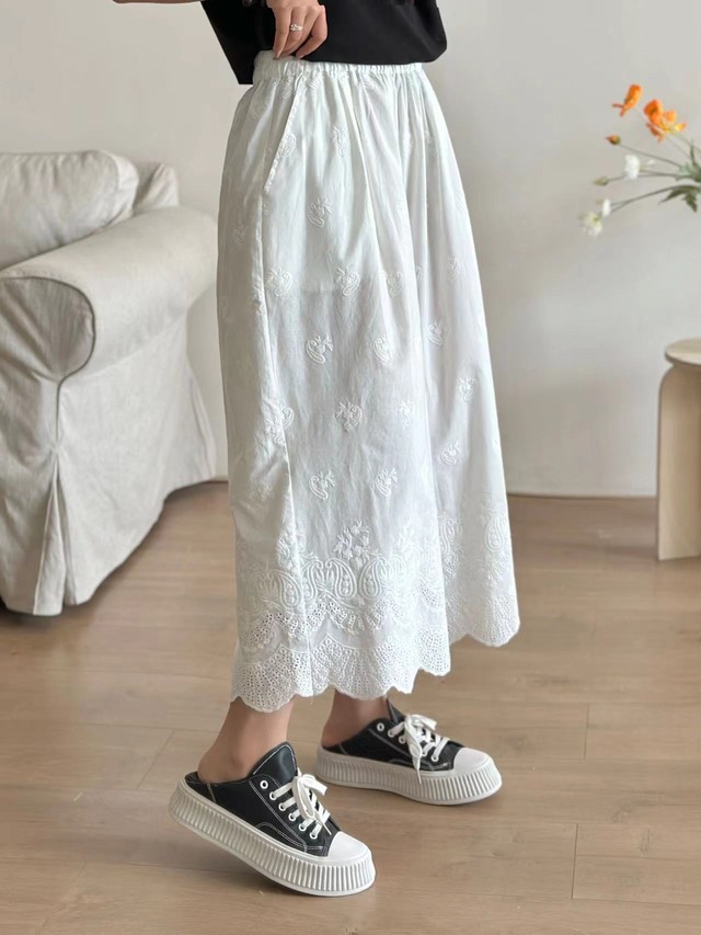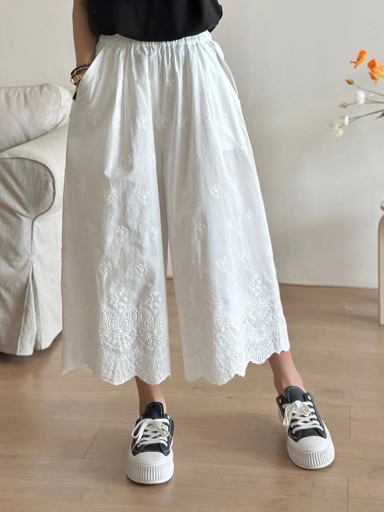 ペイズリー柄の刺繍が魅力のストレートワイドレッグパンツ。大人のカジュアルコーデが決まる。コットン素材のさらっと涼しげな一枚。ウエストはゴム入りでリラクシーな着心地。