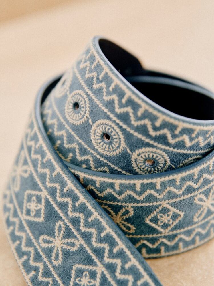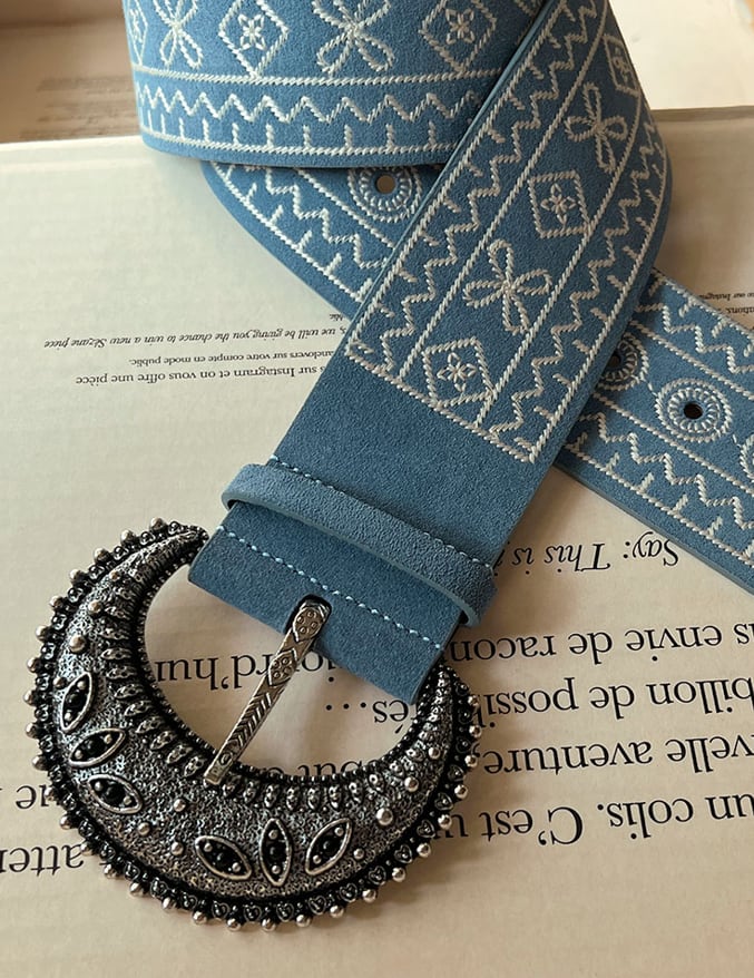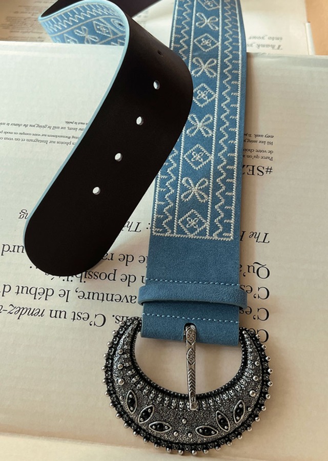アンティーク調の幾何学模様が特徴のレザーベルト。シャツやワンピースなど様々なコーデのアクセントに。