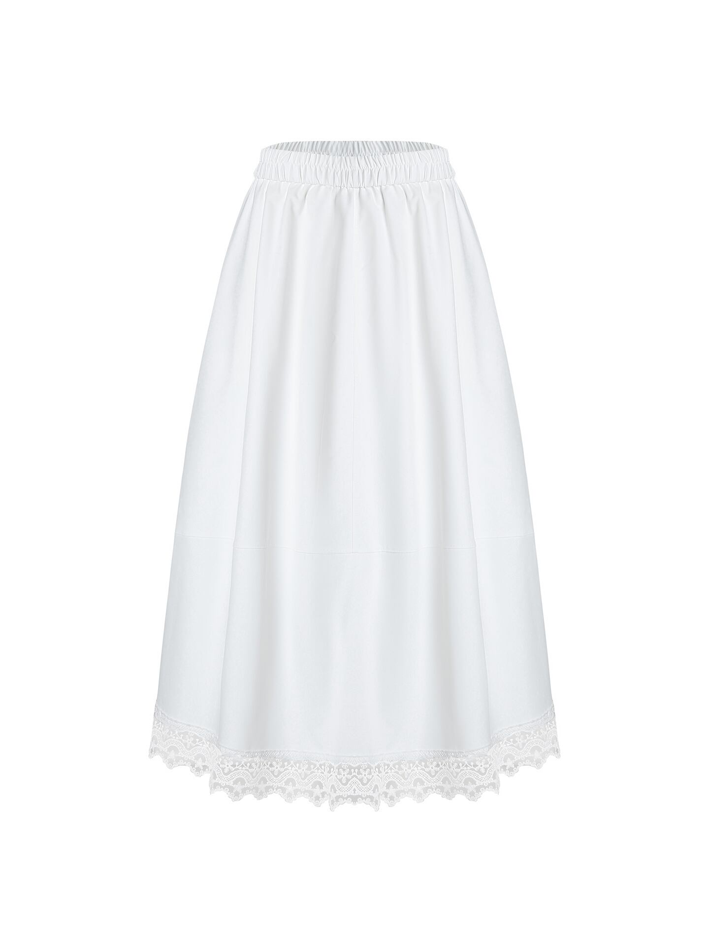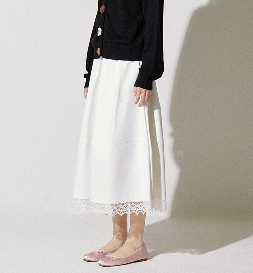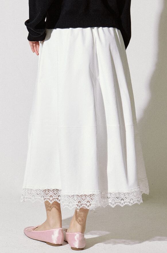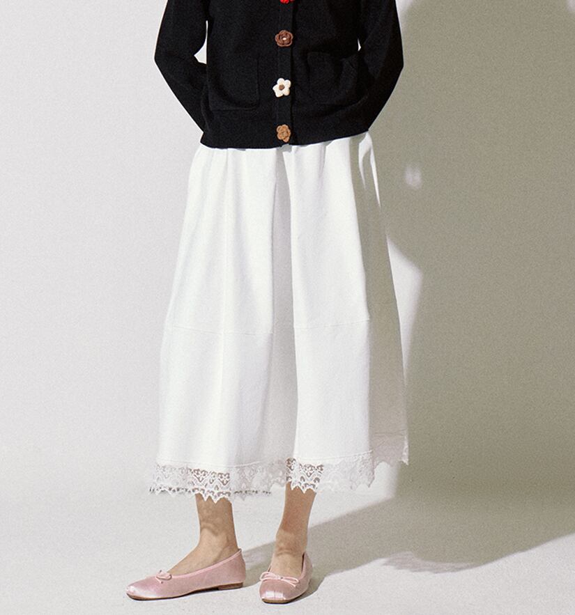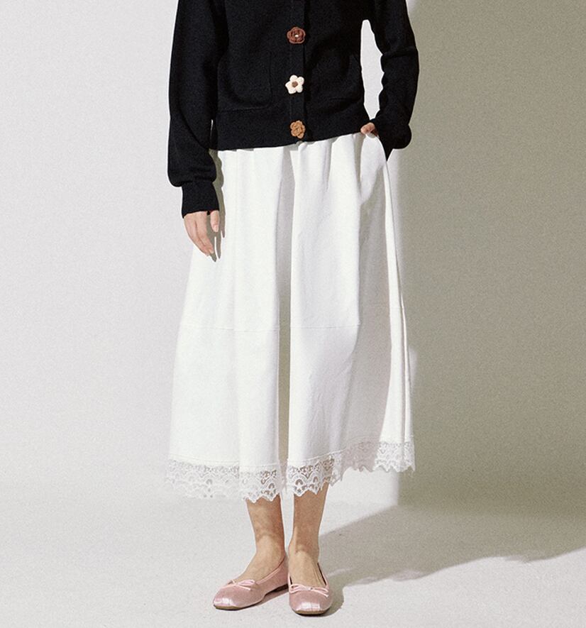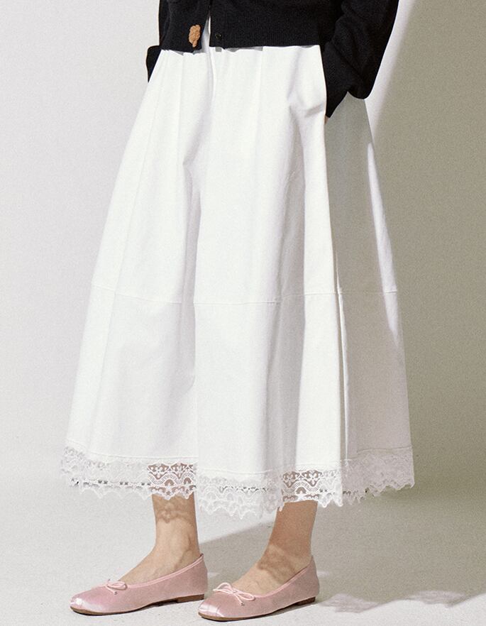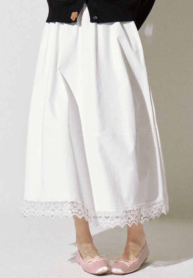 裾に繊細なレースをあしらった、ふんわり広がるフレンチレトロスカート。通気性に優れた肌に優しいコットン素材。ウエストはゴム入りでリラクシーな履き心地。サイドは隠しポケット付。ニットトップスを合わせると優しくスイートな印象に。