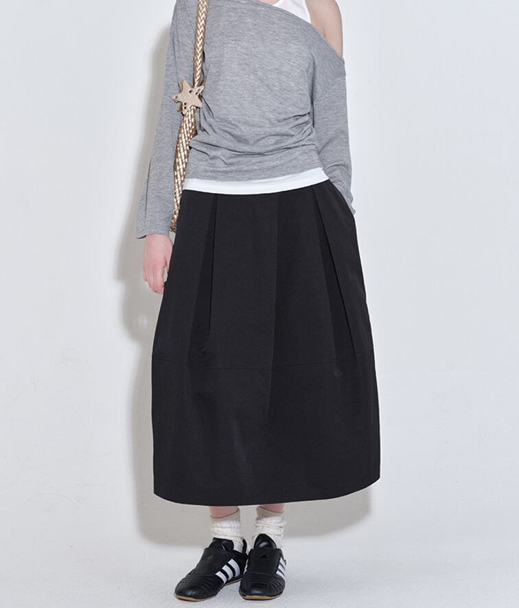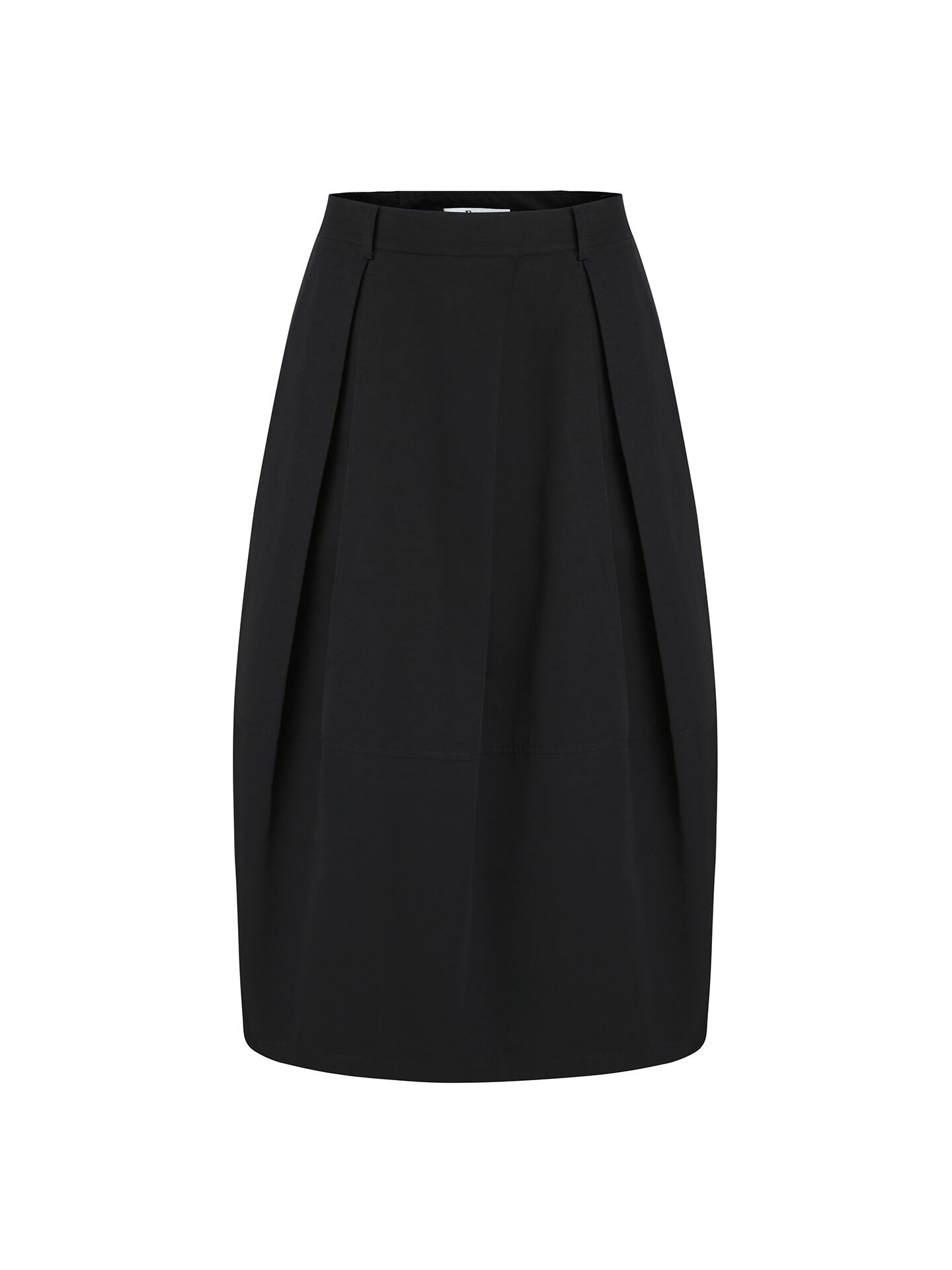 繭のようなふっくらとしたシルエットのバルーンスカート。ウエストのプリーツが自然なボリューム感を演出。コットンとポリエステルをブランドした生地は、程よい厚みとハリがありシワになりにくいのが魅力。深みのあるブラックカラーは落ち着きのある上品な印象。シンプルなシルエットはスタイリッシュで、着回し力も抜群。