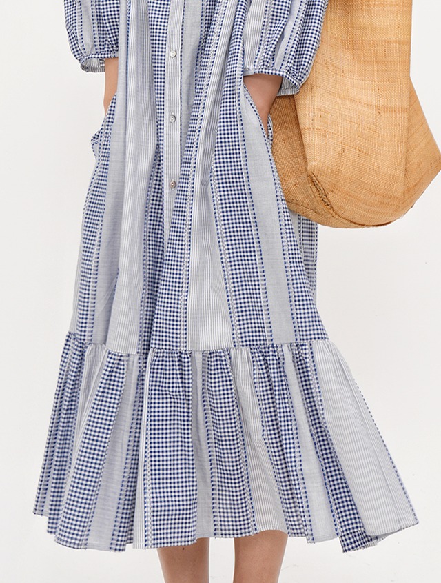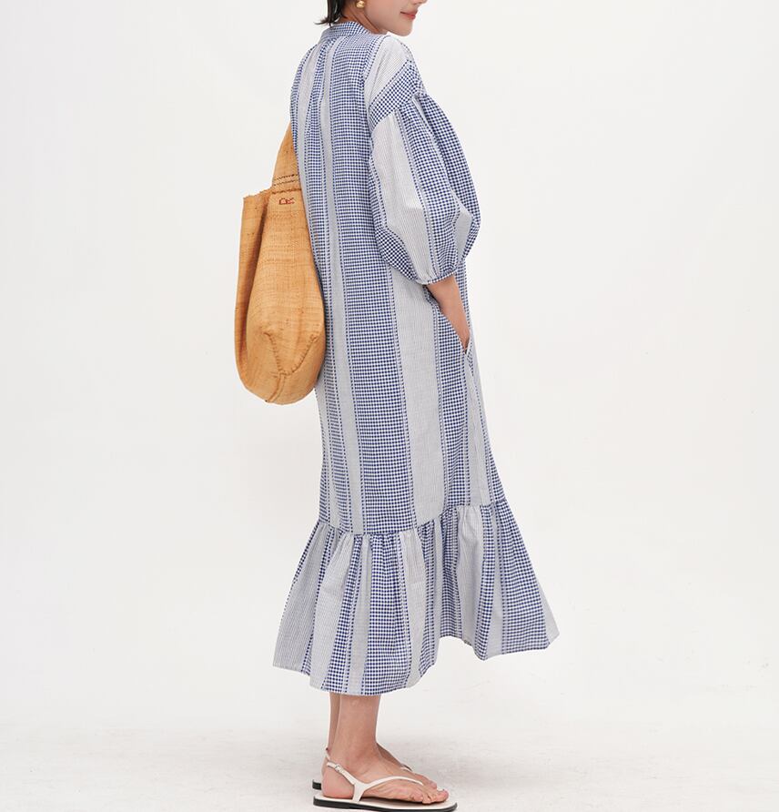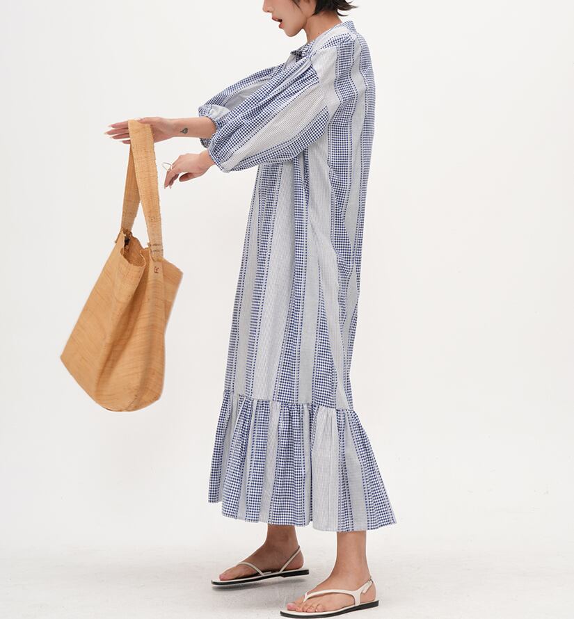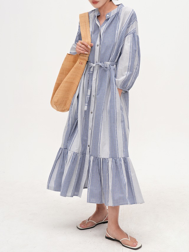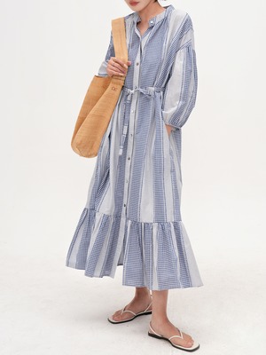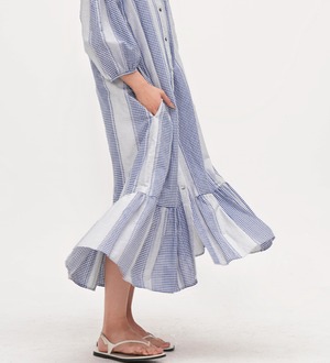 オーガニックブルーストライプデザインのナチュラルな素材感が魅力のAラインワンピース。体のラインをひろわない、ゆったりサイズ感でリラクシーな着心地。ウエストを紐で絞ってメリハリのあるスタイルも楽しめます。デイリーからお出かけまで幅広く活躍するアイテム。