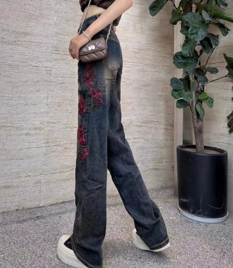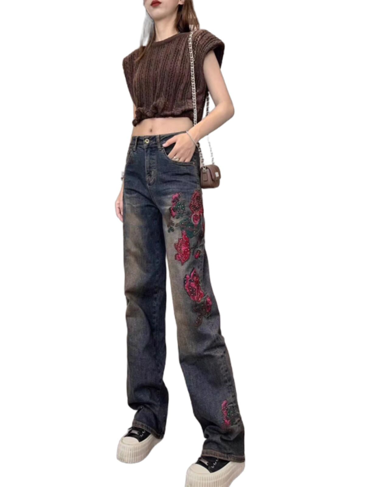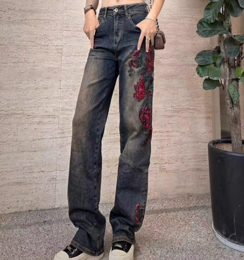 片側にレトロな刺繍を施したビンテージジーンズ。程よい太さのストレートタイプのシルエットで足を長く綺麗に見せてくれます。