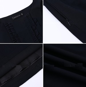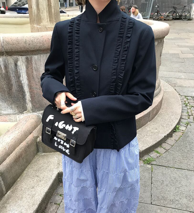 フロントのフリルデザインがポイントのクラッシックスタイルジャケット。首回りをすっきり見せてくれるスタンドカラー。セットアップのワンピースと合わせたスタイリングがおすすめ。