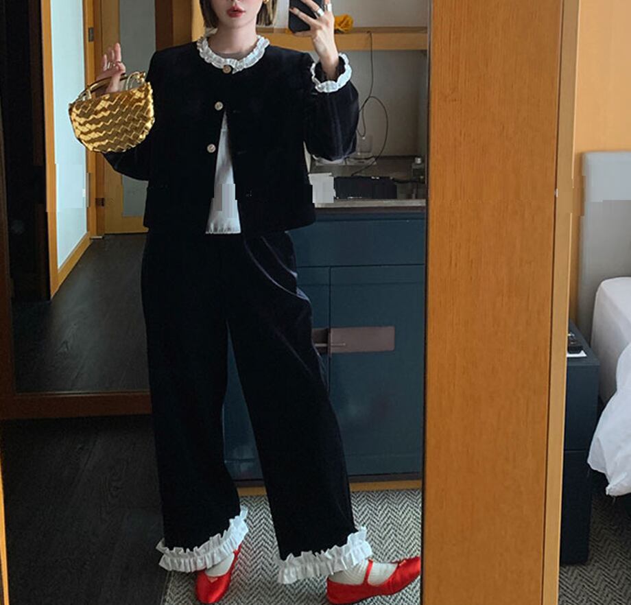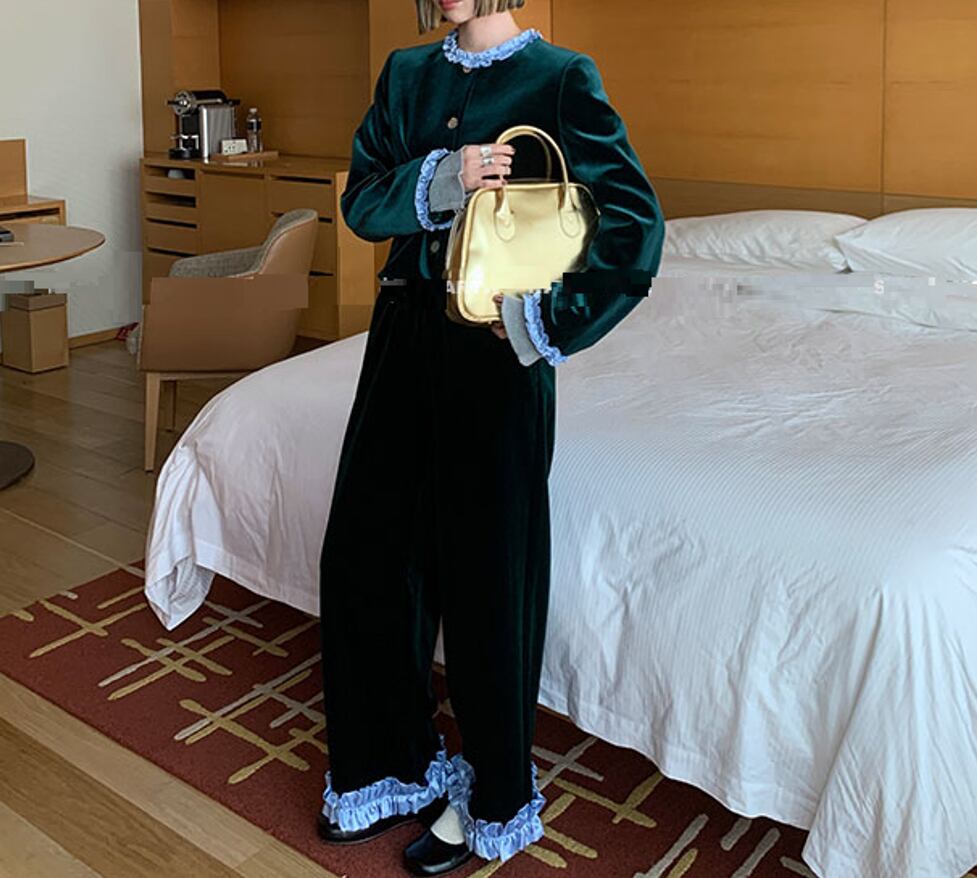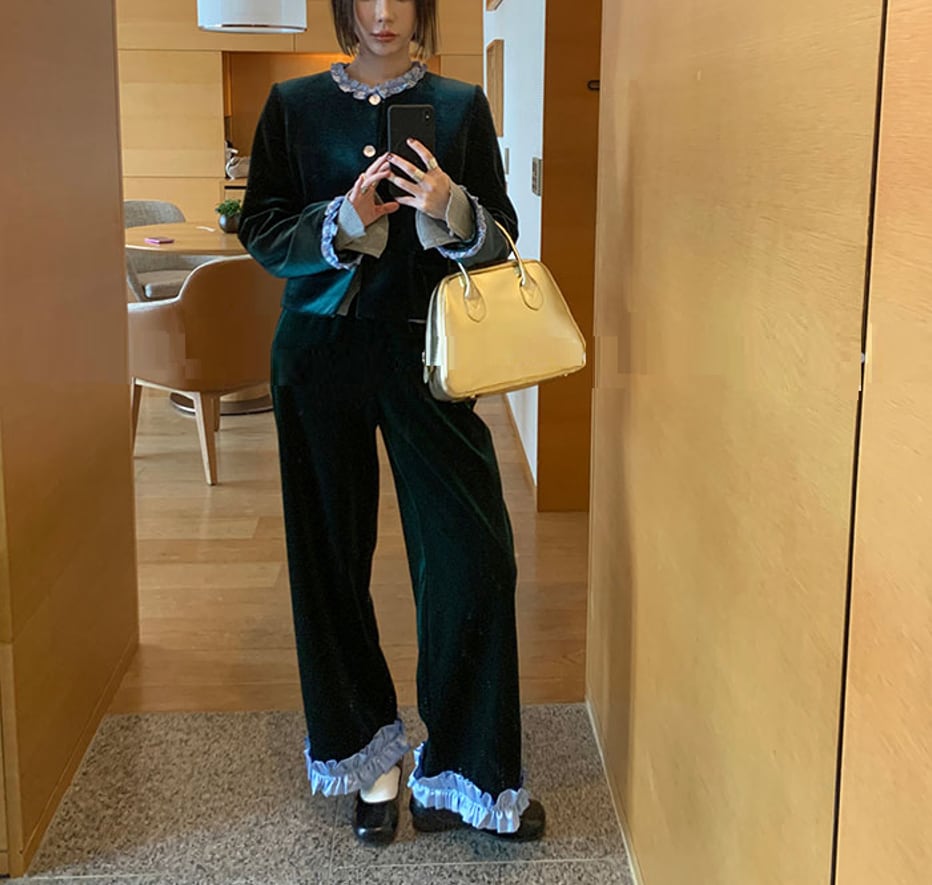 :::::::::::::::::::::::: 【お届けについて】 当ショップの商品は海外より取り寄せ・発送となる為 ご入金から2〜4週間前後でお届けいたします。 【BASE算出 発送までの目安】平均4〜13日 :::::::::::::::::::::::: 裾のフリルがポイントのベルベットトリムパンツ。ウエストはゴム入りでゆったりとした履き心地でスリムなストレートシルエットが足のラインを綺麗に見せてくれます。エレガントで高級感漂うベルベット生地は滑らかで柔らかな手触り。セットアップのジャケットと合わせたスタイリングがおすすめ。 【セットアップアイテムはこちら】 lace velvet short jacket 2colors https://www.jardin-select.com/items/118873931 ◆Color: ブラック グリーン ◆size:XS,S,M,L,XL,XXL XS パンツ丈 91cm / ウエスト 69-84.5cm / ヒップ 93cm / 太もも周り 62.4cm / 脚口 50.5cm S パンツ丈 94cm / ウエスト 72-88.5cm / ヒップ 97cm / 太もも周り 64.7cm / 脚口 52.5cm M パンツ丈 97cm / ウエスト 75-92.5cm / ヒップ 101cm / 太もも周り 67cm / 脚口 54.5cm L パンツ丈 100cm / ウエスト 78-96.5cm / ヒップ 105cm / 太もも周り 69.3cm / 脚口 56.5cm XL パンツ丈 100cm / ウエスト 81-100.5cm / ヒップ 109cm / 太もも周り 71.6cm / 脚口 58.5cm XXL パンツ丈 100cm / ウエスト 84-104.5cm / ヒップ 113cm / 太もも周り 73.9cm / 脚口 60.5cm ◆mode linfo: 168cm 53kg Lサイズ着用 ◆Material: ベルベット 【商品管理番号】2025091803 ¨¨¨¨¨¨¨¨¨¨¨¨¨¨¨¨¨¨¨¨¨¨¨¨¨¨¨¨¨¨¨¨¨¨¨¨¨¨¨¨¨¨¨¨¨ 【注意事項】 ・商品お届けまでに3〜4週間程頂きます。 ・海外在庫のため在庫情報に時差が生じますため 在庫切れや生産中止、生産に遅れがある場合は、受注後でも- キャンセルさせていただく恐れがございます。 予めご了承ください。 ・イメージ違い・サイズ違いによる交換はいたしかねます。 ・スマートフォンやパソコンの液晶の違いにより、 商品の色味に若干の差が発生する場合がございます。 ・発送時期によりデザイン仕様(素材や細部)の変更が ある場合がございます。 こちらの1と2をご確認ください。 1:ショップ説明 https://www.jardin-select.com/about - 2:よくいただくご質問Q&A https://www.jardin-select.com/blog/2020/09/15/083458 ¨¨¨¨¨¨¨¨¨¨¨¨¨¨¨¨¨¨¨¨¨¨¨¨¨¨¨¨¨¨¨¨¨¨¨¨¨¨¨¨¨¨¨¨¨ 【お支払い方法】 以下の各種お支払い方法をお選びいただけます。 ・BASEかんたん決済 ・クレジットカード決済(VISA/Master/JCB/AMERICAN EXPRESS) ・キャリア決済 ・銀行振込 ・コンビニ決済・Pay-easy 皆さまに喜んでいただけるように誠心誠意対応して参ります。最後までお取り引きどうぞ宜しくお願いいたします。
