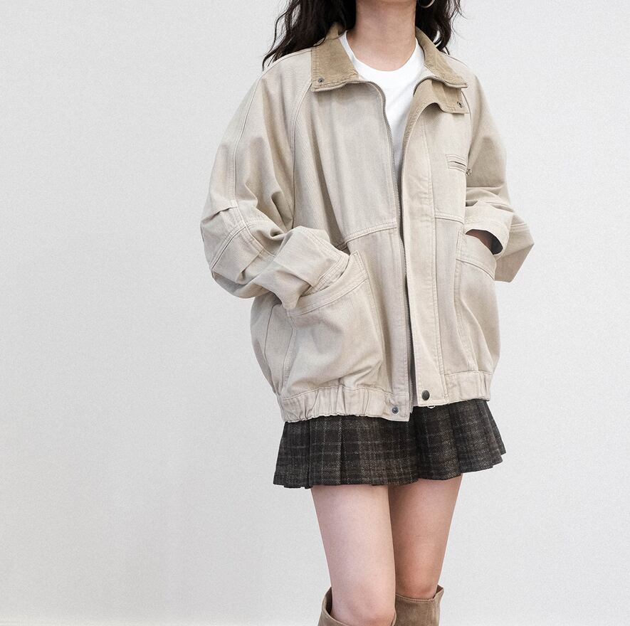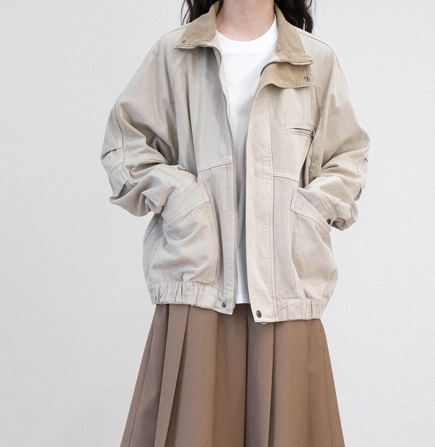 コーデュロイ生地の襟がポイントのメンズライクなデニムジャケット。サンドウォッシュを施したしっかりした生地で着こむほど柔らかく馴染んでいきます。スカートともバランスがとりやすくパンツと相性抜群。