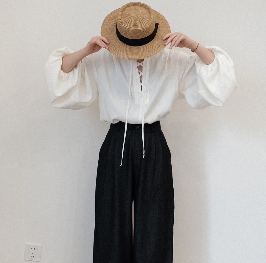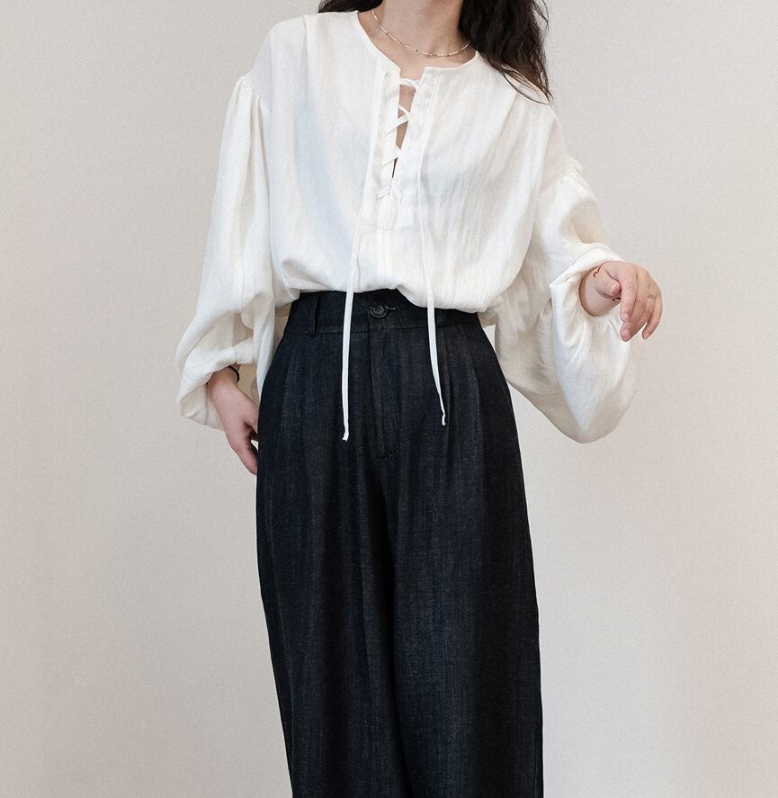 立体感のあるたっぷりのパフスリーブが魅力のシャツ。フロントのリボンタイがポイント。旬なクロップド丈なので足長が長く見えてスタルアップ効果も。