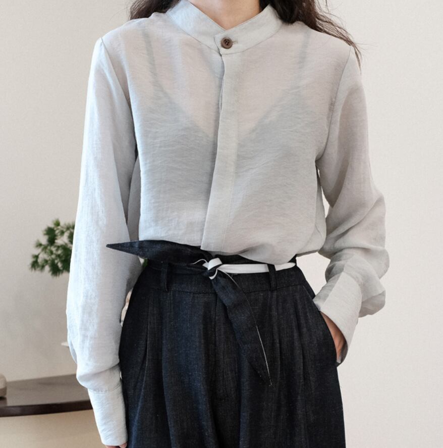 サンドウォッシュ加工を施したナチュラルな風合いの洗練された上品なシャツ。透け感のある生地で程よい光沢感と柔らかさが魅力の一枚。