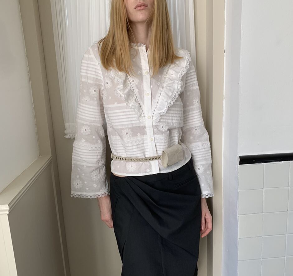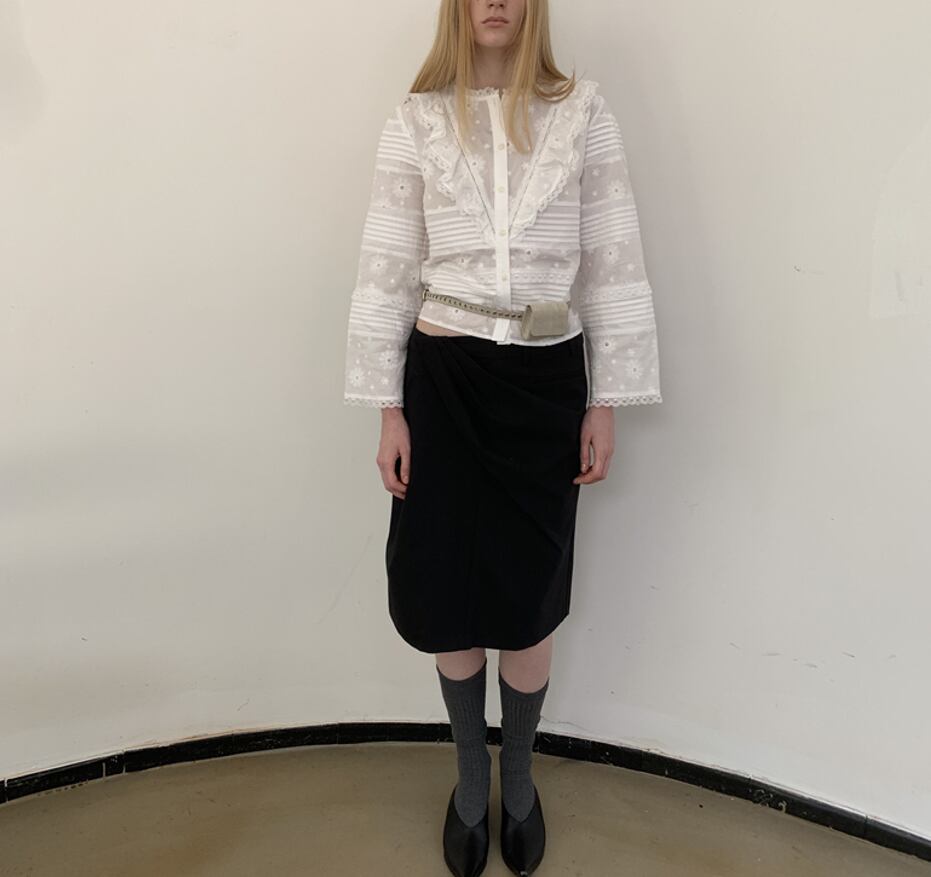 繊細なレースの刺繍模様が魅力のクロップドスリーブドールトップ。全体に短く仕立てたシルエットですっきりスタイルよく見せてくれます。