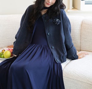 立体的なフラワーモチーフがポイントのシンプルなスタンドカラージャケット。ショート丈ジャケットはウエストラインを高めに引き上げ全体のシルエットをすっきりと見せてくれます。ジーンズと合わせてカジュアルに、スカートと合わせてエレガントなスタイルなど様々なコーデが楽しめます。