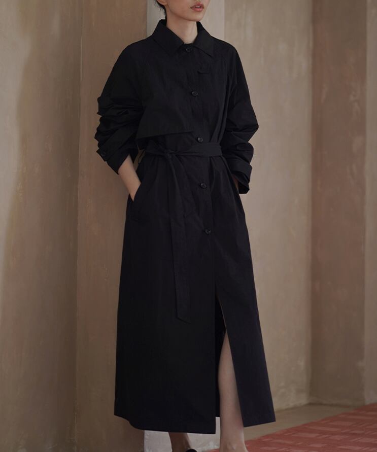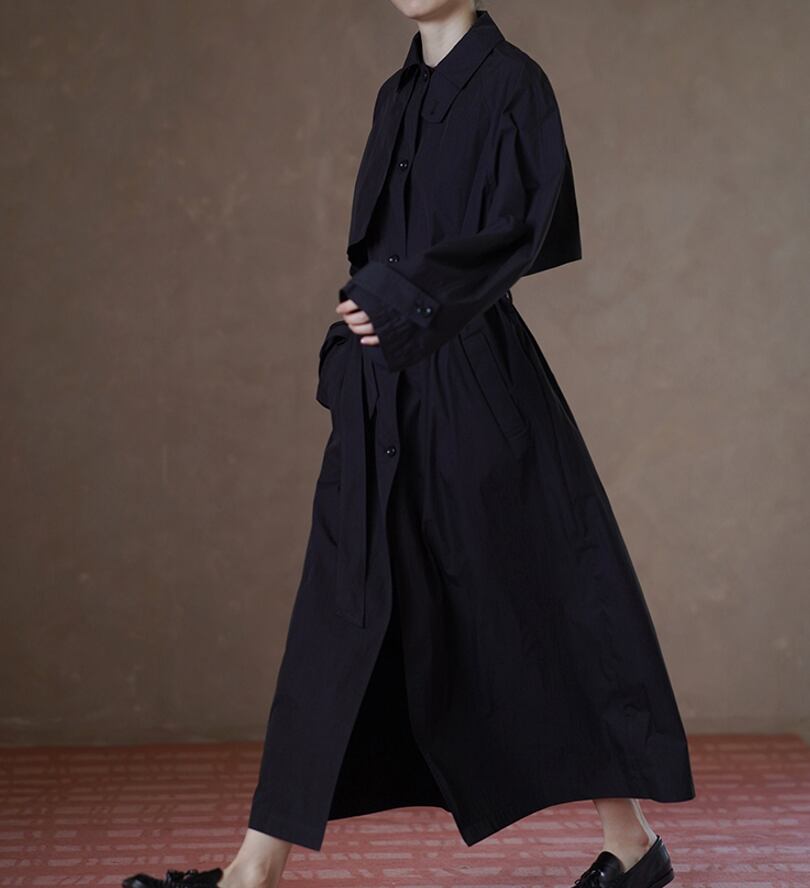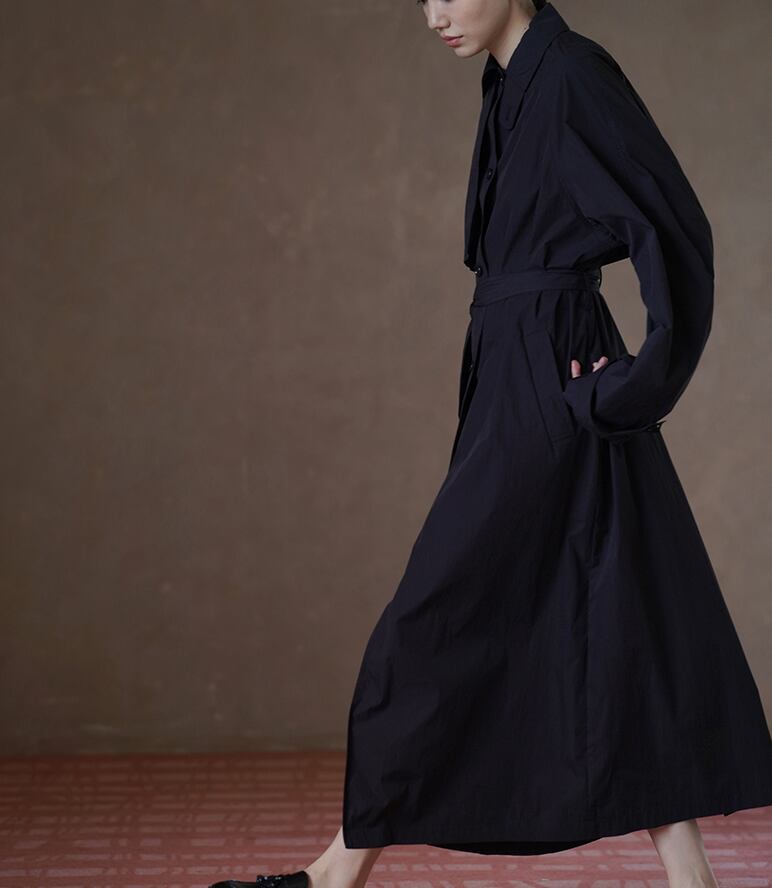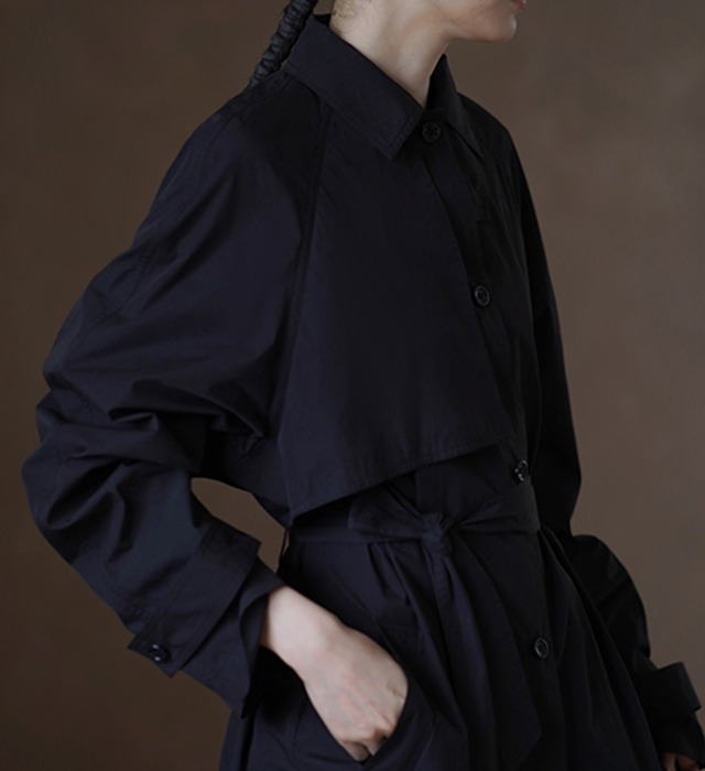 ゆったり幅広に仕立てたワイドラペルデザインのクラシックトレンチコート。しなやかなでドライな風合い、心地よいストレッチ性とサンドコットンの肌触りが特徴のコットン混紡生地仕立て。