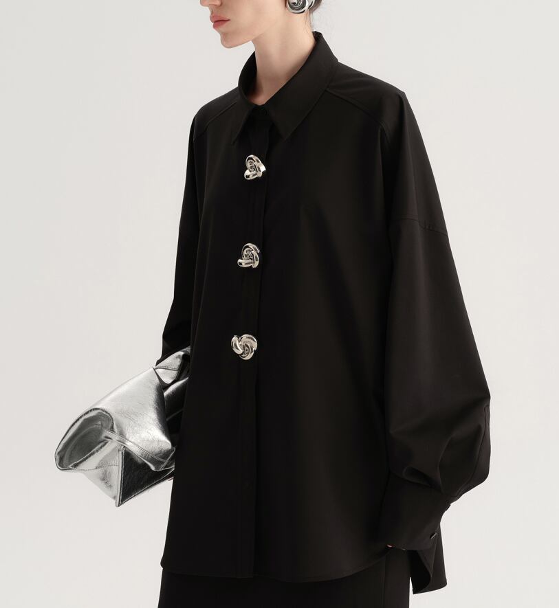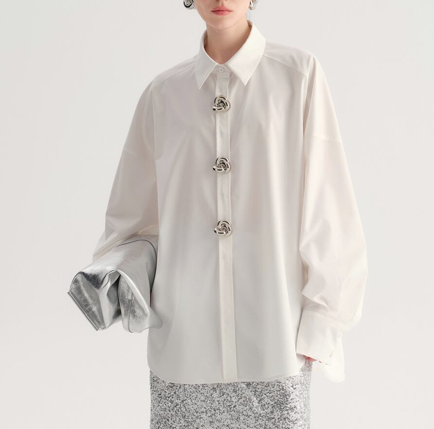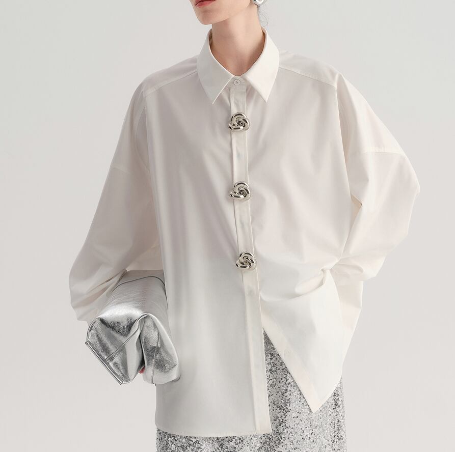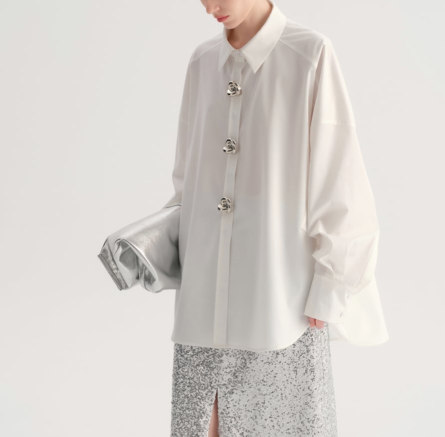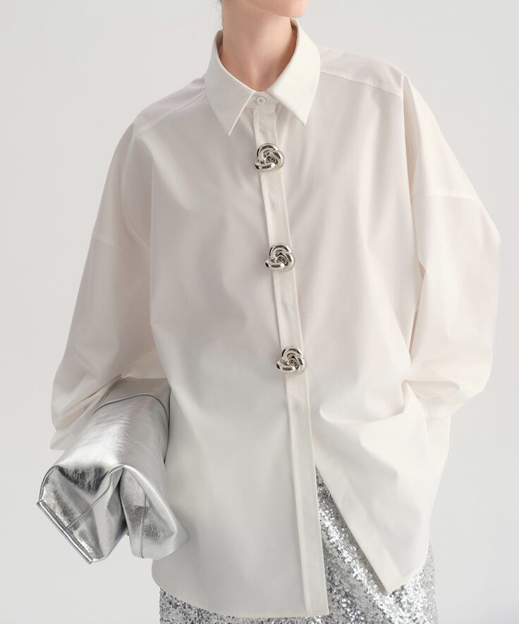 フロントに3つ並んだビックフラワーボタンが目を惹くクラッシックスタイルシャツ。