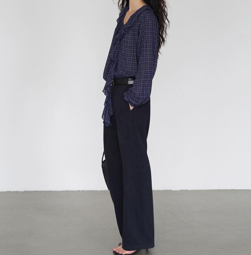 ネックから落ちるフリルが華やかさを添えるブルーチェックVネックシャツ。深めのVネックがデコルテラインを綺麗に見せてくれます。ゆったり抜け感のあるシルエットが大人のこなれ感を演出。