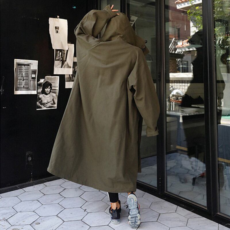オーバーサイズのミリタリーテイストたっぷりのフード付ロングコート。さらと羽織って一枚で決まるアウター。
