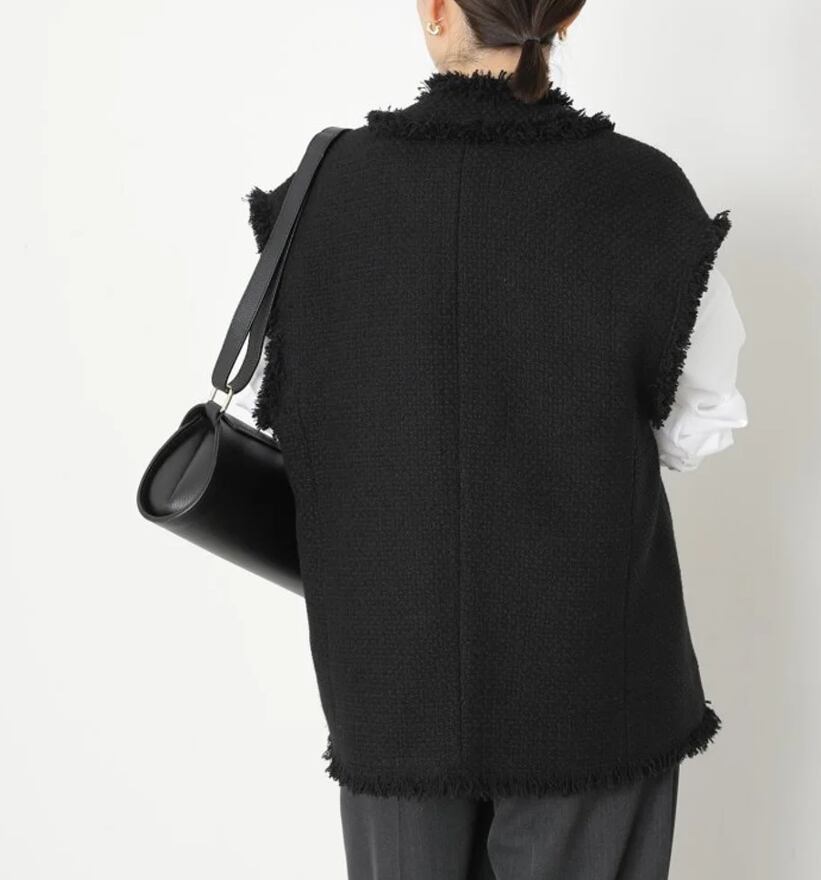 上質なツイード素材を使用した洗練された印象のベストジャケット。ゆったりしたサイズ感なので様々なレイヤードコーデが楽しめます。
