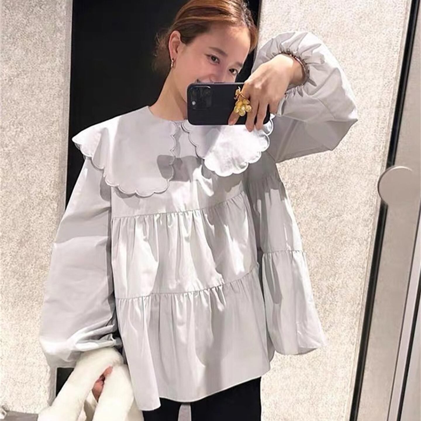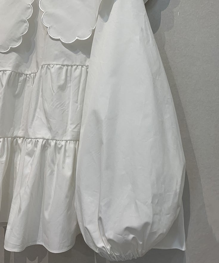 刺繍で丸く縁取られたビックカラーが魅力のランタンスリーブシャツ。ボトムとバランスがとりやすいショート丈。ふんわり広がるティアードデザインが目を惹く華やかな一枚。ハリがありさらっと肌触りの良い生地です。