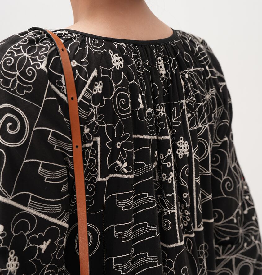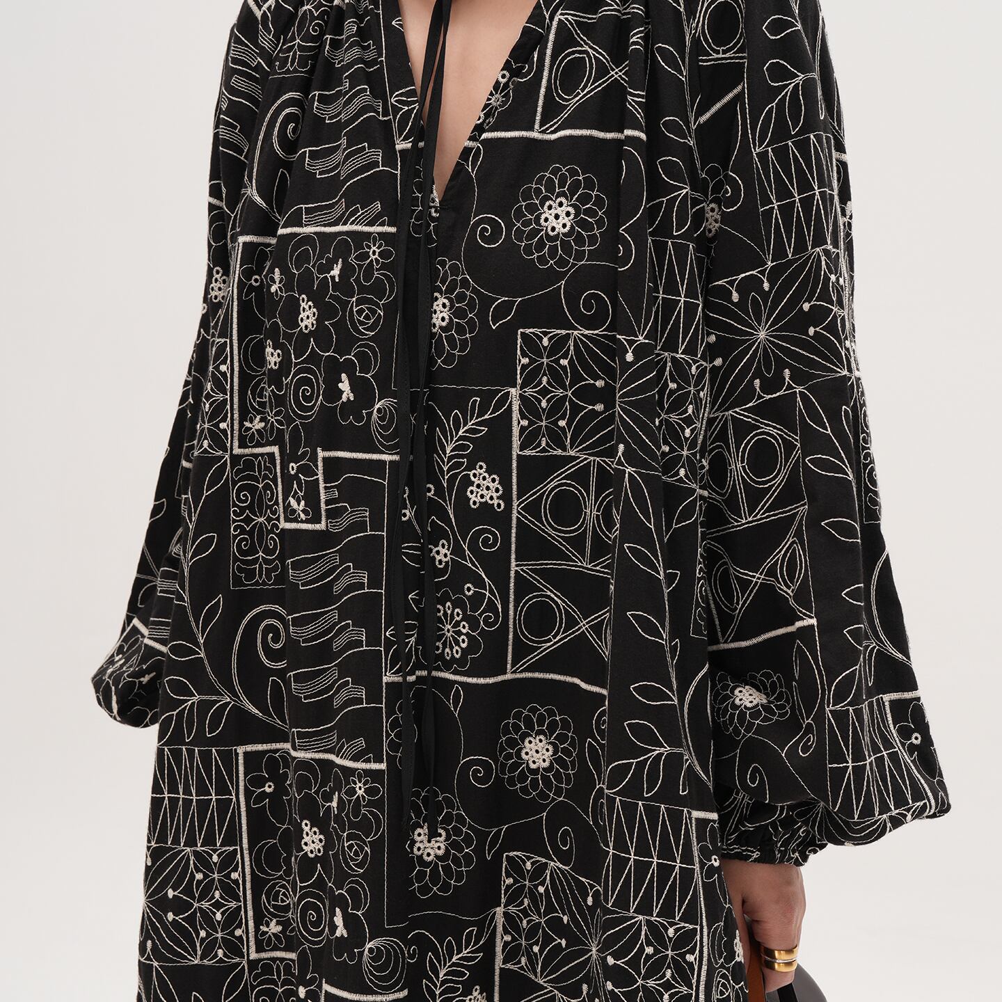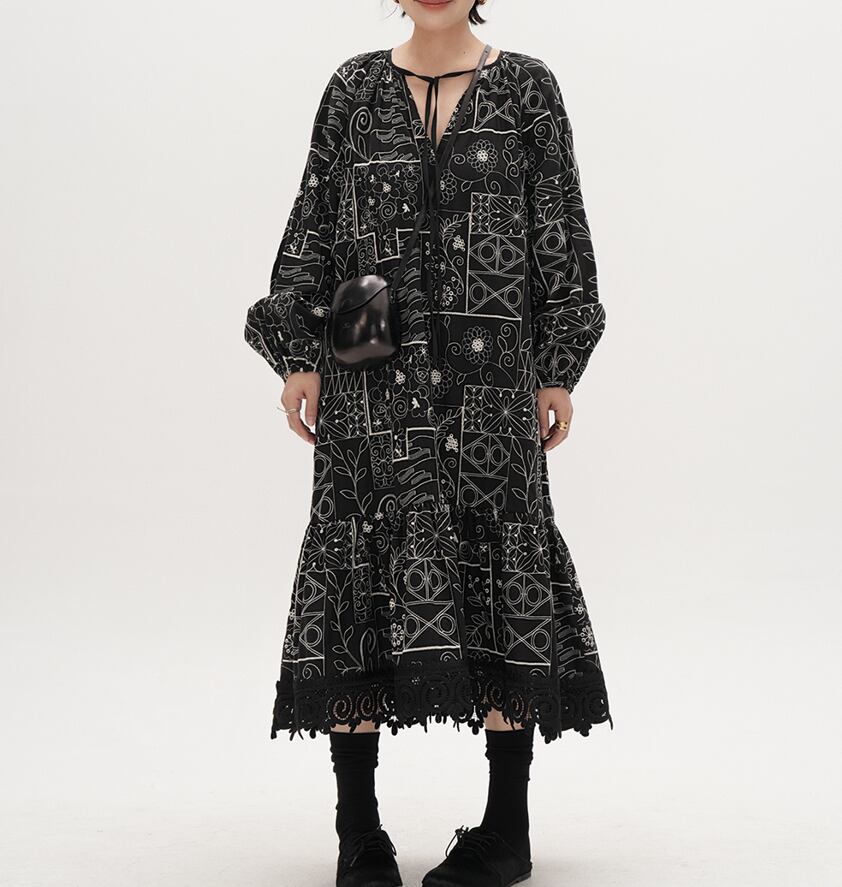 レトロな幾何学模様と裾のフリルが特徴的なルーズワンピース。首元で結んだリボンがアクセントに。ゆったり体のラインを拾わないシルエット。デイリーからお出かけまで幅広く活躍するアイテム。