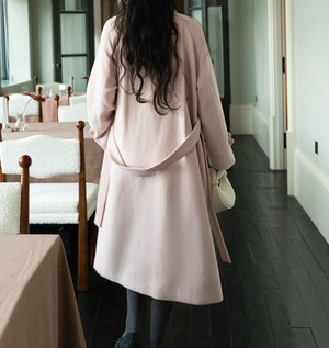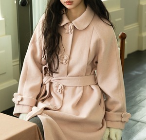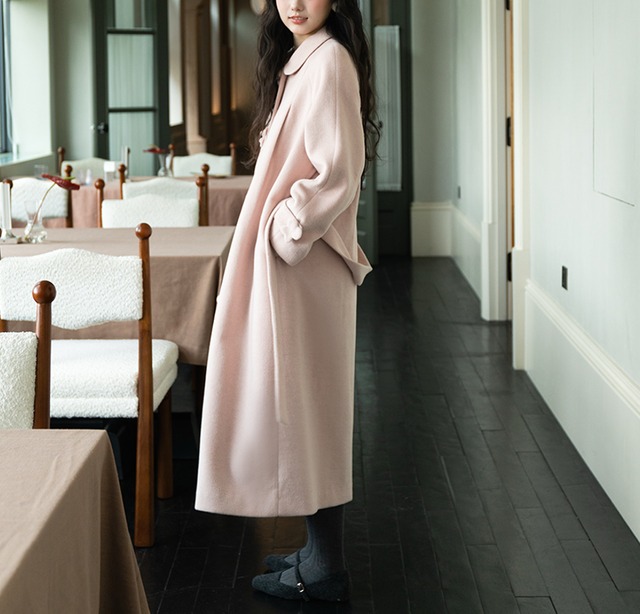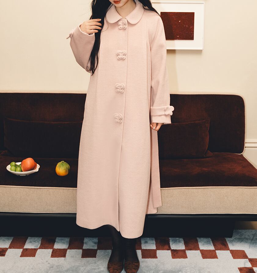 レトロな可愛らしと優雅さを演出するロングコート。立体的な蝶のモチーフがポイント。繊細で柔らかなウール混紡生地を使用。やさしい色合いの淡いピンクカラー。
