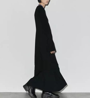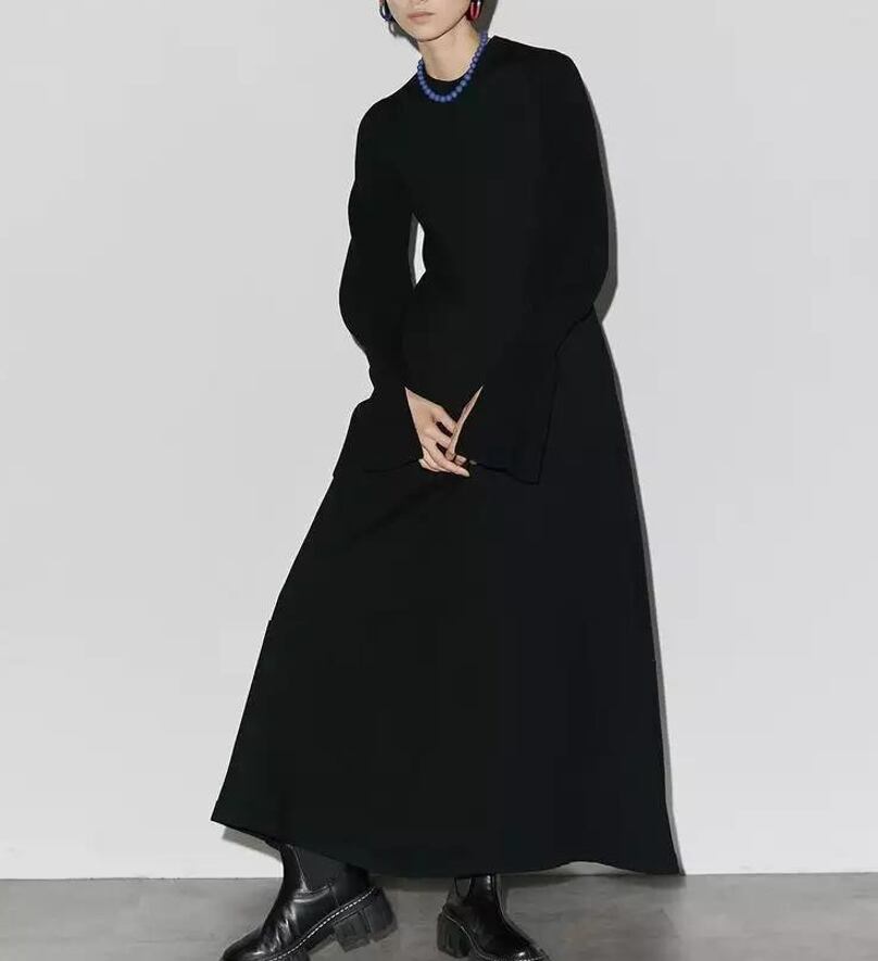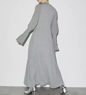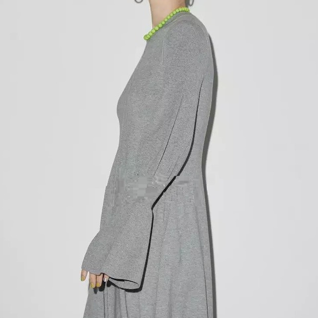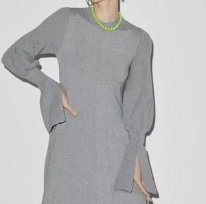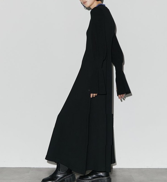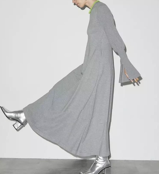 スリットが入った長い袖がポイントのランタンスリーブニットロングワンピース。すっきり縦長シルエットでスタイルをよく見せてくれます。