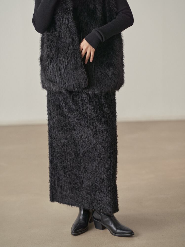 ストライプに流れる長い毛足のデザインが華やかなスリムロングスカート。シャツやカットソーなどシンプルなトップスと相性◎ウエストがゴムタイプなので、上品さも兼ね備えつつ着心地も抜群。