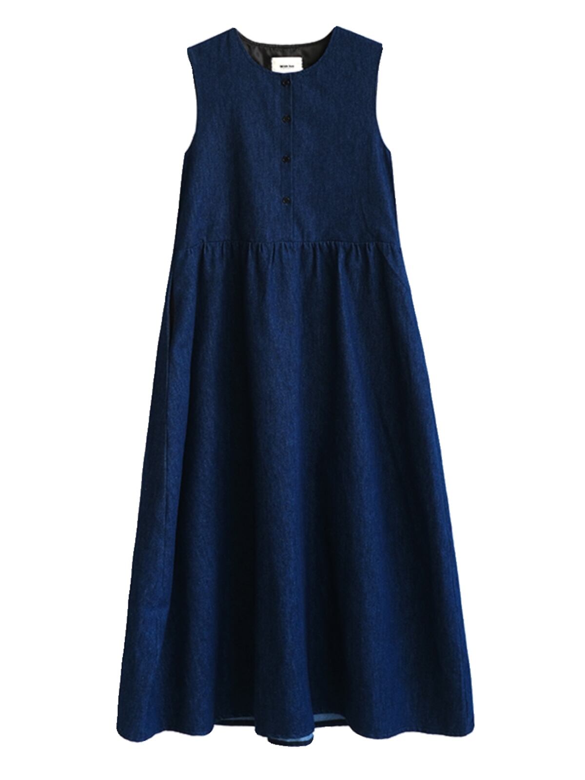 ダークデニム生地で作られたレトロなノースリーブマキシ丈ワンピース。