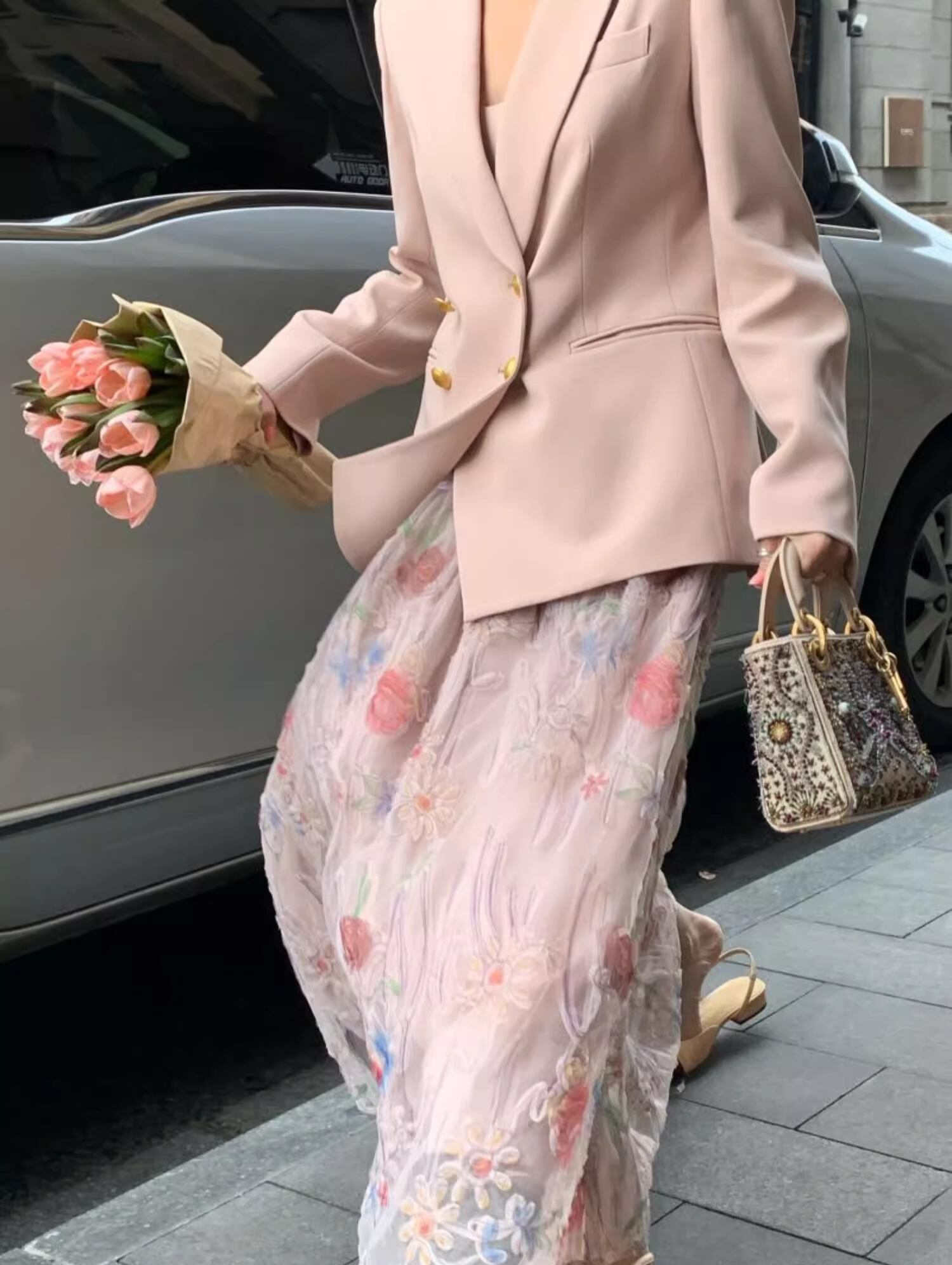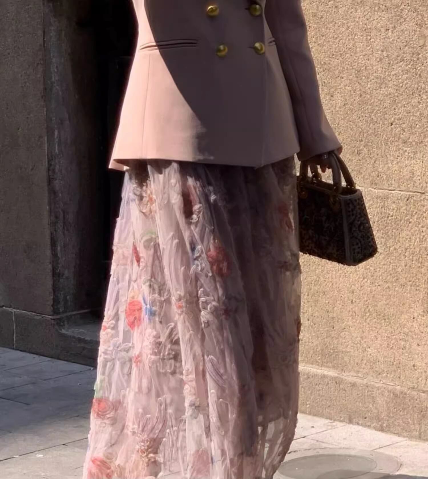 華やかな淡いフラワープリントが広がるチュールスカート。ライトピンクのレースがひらりと揺れる上品さが魅力の一枚。