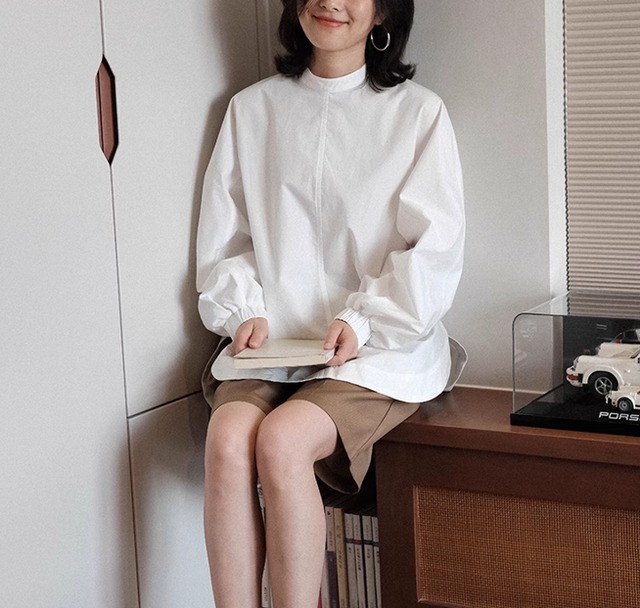 愛らしいパフスリーブがポイントのシンプルなスタンドカラーシャツ。ゆったりしたシルエットでどんなボトムともマッチする一枚。