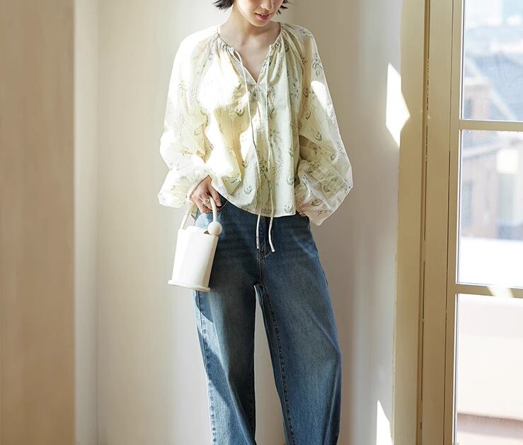 バルーン袖のゆったりしたシルエットの花柄シャツ。透け感ある生地で大人フェミニンな雰囲気を演出。胸元にアクセントを添える襟紐つき。