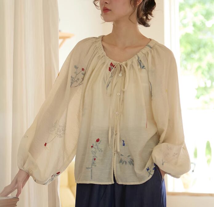 balloon sleeve flower embroidered shirt【2024060502】